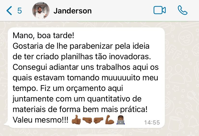 AS NOSSAS PLANILHAS SÃO TOTALMENTE AUTOMÁTICAS, VOCÊ IRÁ SURPREENDER SEUS CLIENTES FAZENDO ORÇAMENTOS BEM MAIS PRECISOS E EM TEMPO RECORDE.